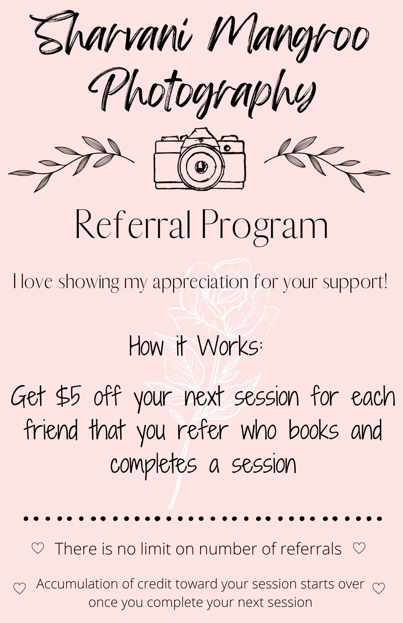 The referral program is an ongoing promotion that you can take advantage of year- round so be sure to tell your friends all about me and get that discount on your next session!